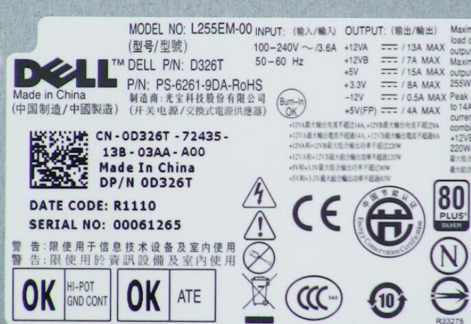 d326t 0d326t 255w dell optiplex 360 / 760 / 780 desktop 255w power supply